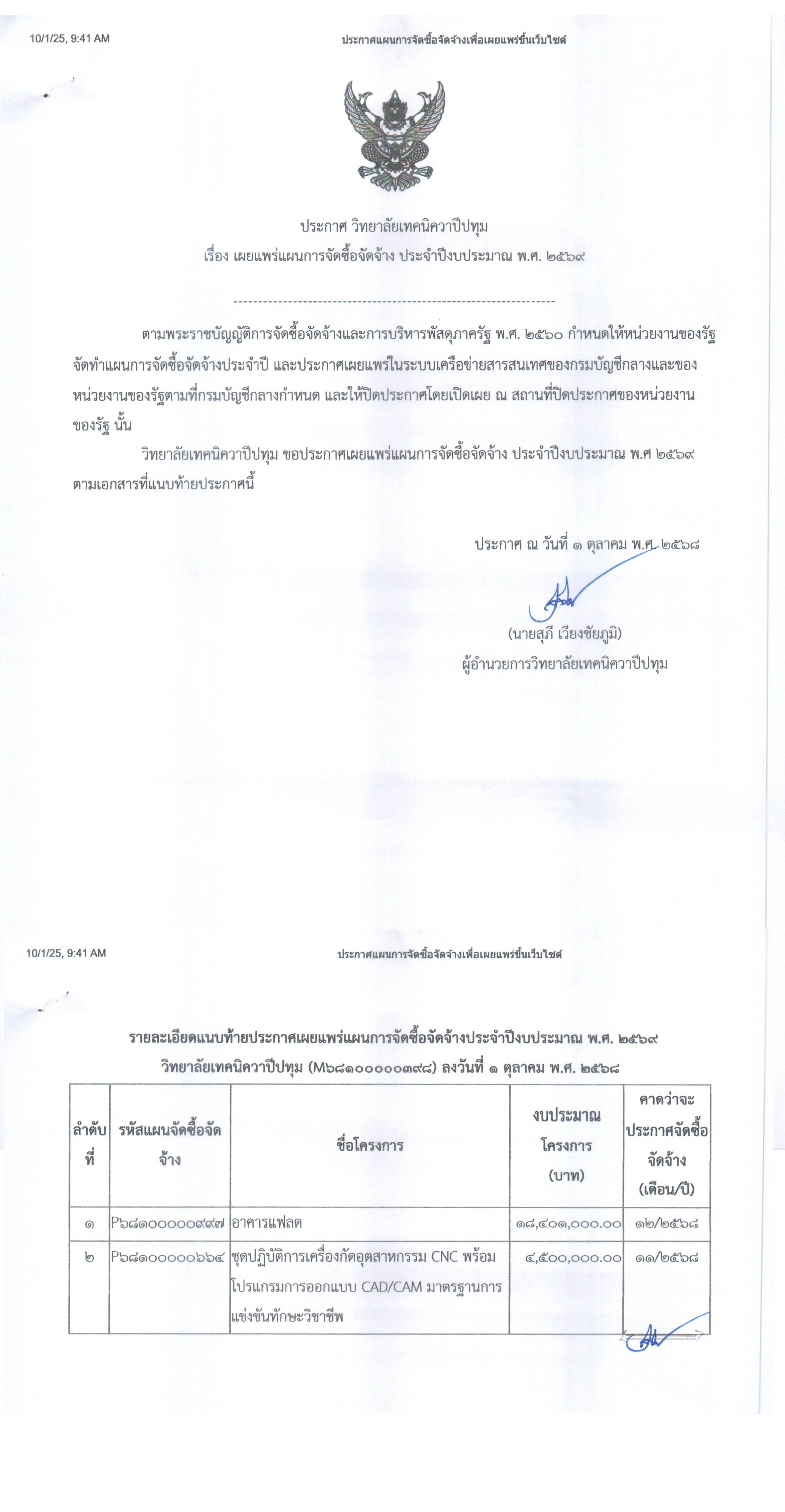 ตามเอกสารที่แนบท้ายประกาศนี้ ประกาศ ณ วันที่ ๑ ตุลาคม พ.ศ. ๒๕๖๘